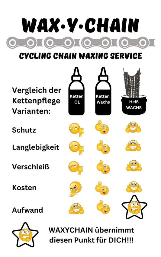 - Keine Kontamination: Der Wachsvorgang beginnt mit einer gründlichen Reinigung, bei der sämtliches Fett und Schmutz entfernt wird. Dies führt zu einer kontaminationsfreien Kette, die Geschwindigkeit und Haltbarkeit erhöht.